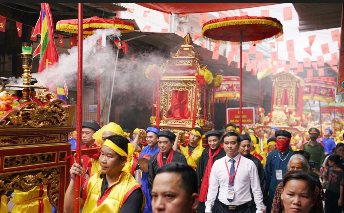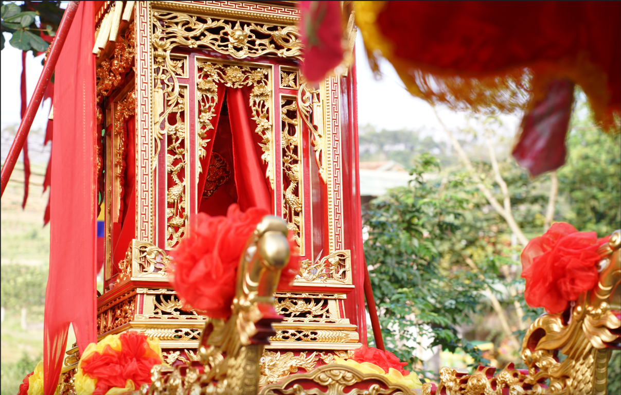 Nổi bật nhất trong đoàn rước là hai kiệu bát cống (rước quan Trần triều, rước Mẫu). Kiệu được trạm trổ kỳ công, đẹp mắt, khiêng mỗi kiệu có 8 thanh niên trai tráng khỏe khoắn