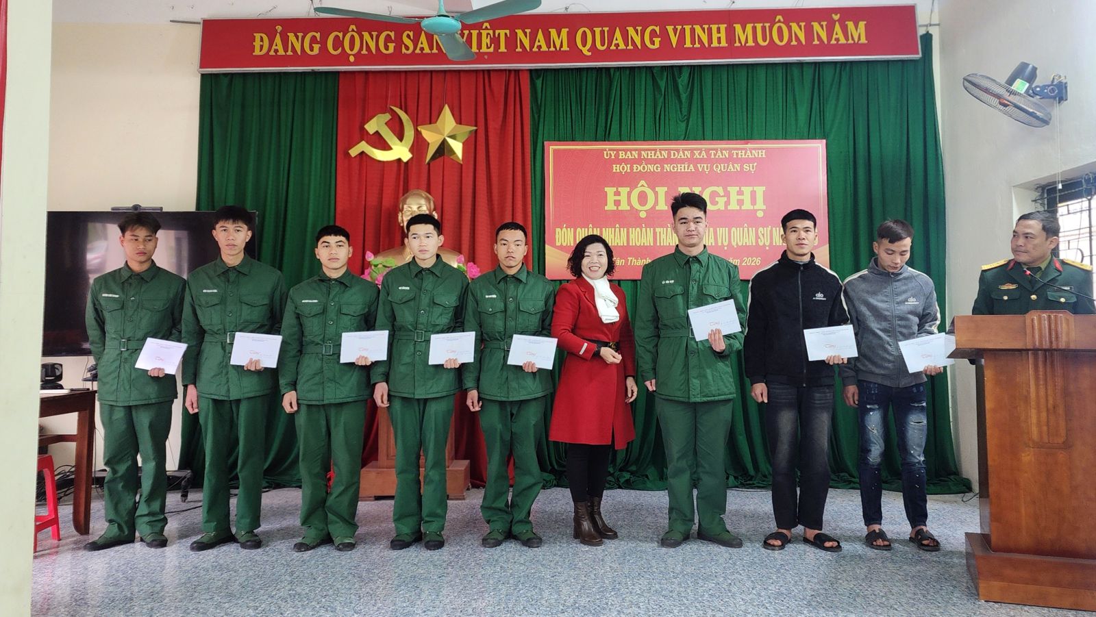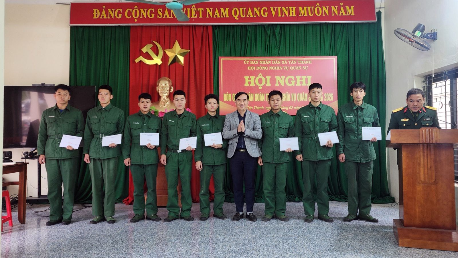 Sáng ngày 02/02/2026, tại hội trường UBND xã, Hội đồng nghĩa vụ quân sự xã Tân Thành tổ chức đón nhận quân nhân hoàn thành nghĩa vụ quân sự tại ngũ trở về địa phương. Dự hội nghị có đồng chí Phan Thị Toán, Phó Bí thư Thường trực Đảng uỷ; đồng chí Trần Văn Tùng, Phó Bí thư Đảng uỷ, Chủ tịch UBND xã; các đồng chí thành viên Hội đồng nghĩa vụ quân sự xã; đại diện lãnh đạo các cơ quan, đơn vị và các quân nhân hoàn thành nghĩa vụ trở về địa phương.