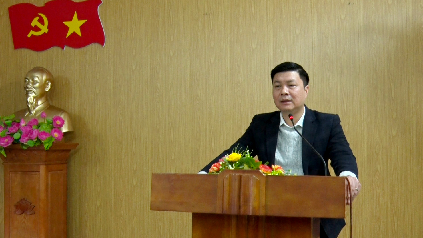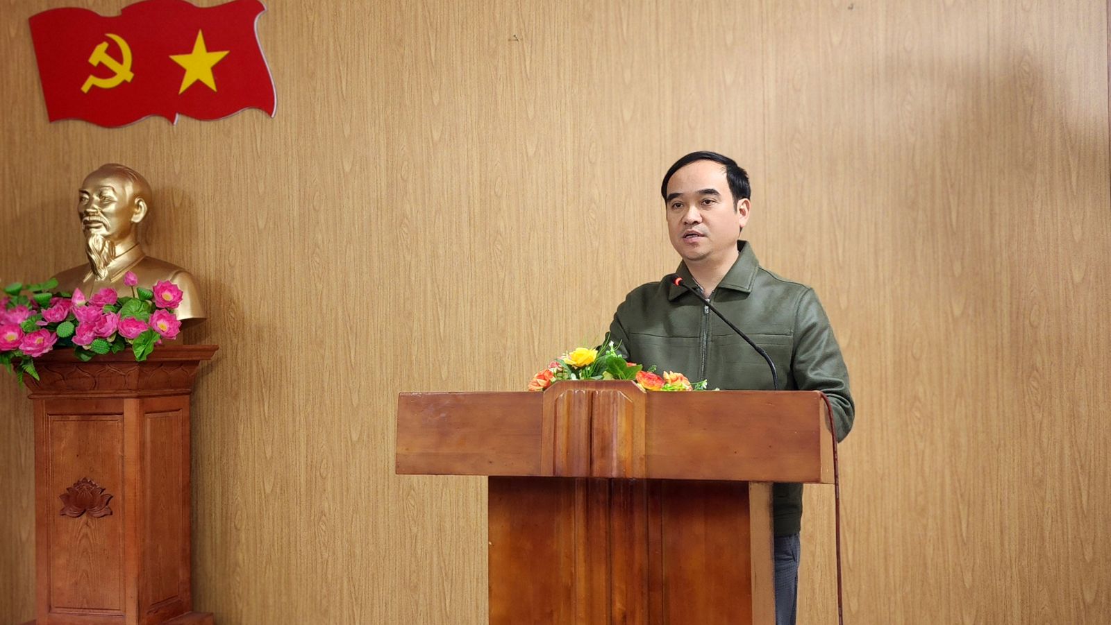 Đồng chí Trần Văn Tùng, Chủ tịch UBND, Chủ tịch Uỷ ban Bầu cử xã phát biểu tại hội nghị