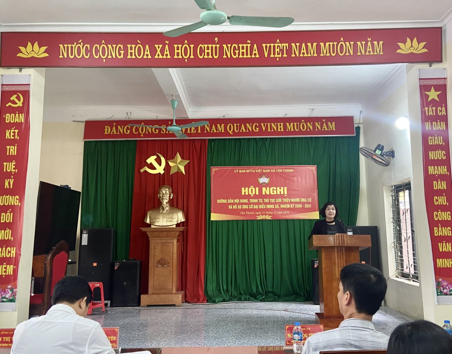 Sáng ngày 22/12/2025, Ban Thường trực Ủy ban Mặt trận Tổ quốc Việt Nam xã Tân Thành tổ chức Hội nghị hướng dẫn nội dung, trình tự, thủ tục giới thiệu người ứng cử đại biểu Hội đồng nhân dân xã Tân Thành nhiệm kỳ 2026 – 2031. Hội nghị được tổ chức tại Hội trường UBND xã Tân Thành.