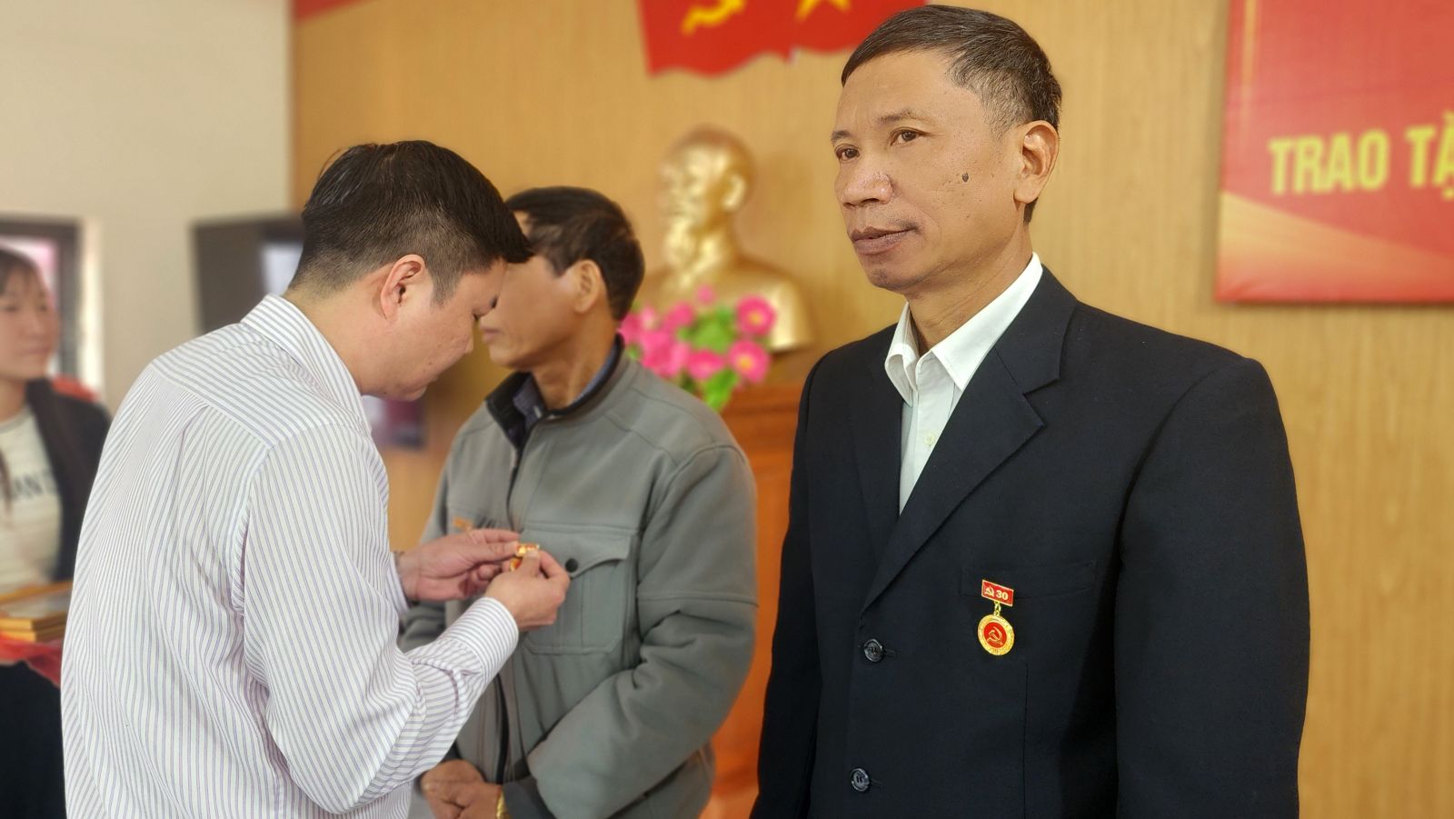 Đồng chí Nguyễn Vĩnh Phú, Bí thư Đảng uỷ, Chủ tịch HDDND xã trao huy hiệu 30 năm tuổi đảng cho 2 đảng viên đủ điều kiện.